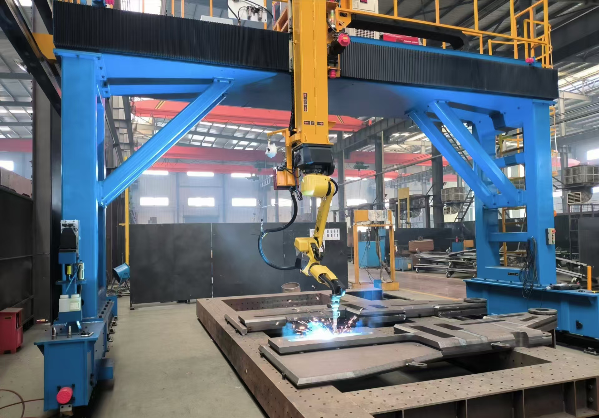 通過六軸機器人、三軸龍門行走機構(gòu)以及兩軸 L 型變位機配合使用,使得該機器人工作系統(tǒng)有較大的工作范圍和良好的系統(tǒng)柔性,即使大型復(fù)雜工件上可達性不好的空間焊縫,也可輕松勝任!