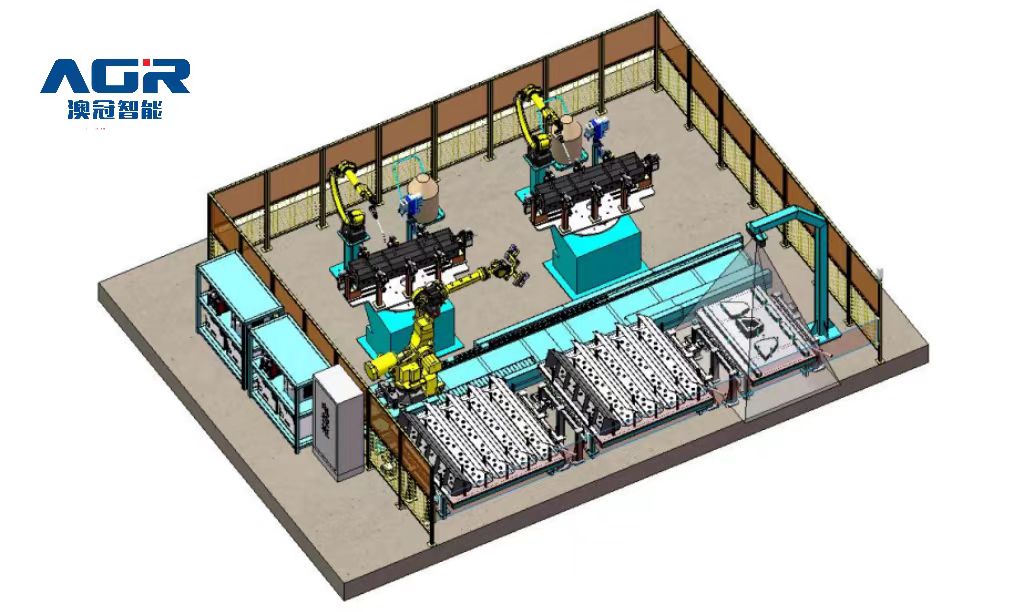 整體布局:工作站配備 2 臺(tái)發(fā)那科焊接機(jī)器人、1 臺(tái)發(fā)那科搬運(yùn)機(jī)器人、2套兩軸變位機(jī)、4 套組對工裝、1 套搬運(yùn)機(jī)器人地軌、1 套抓手、2 套旋轉(zhuǎn)立柱除塵系統(tǒng)、1 套視覺系統(tǒng)、1 套電氣系統(tǒng)及對應(yīng)輔助設(shè)備。