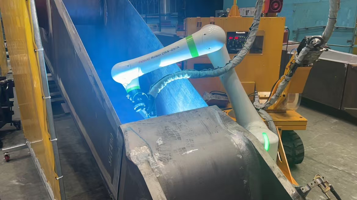 基座邊梁機器人工作站主要由一臺履帶底盤、一臺發(fā)那科CRX-25iA機器人、一套松下焊接設(shè)備、以及其余周邊設(shè)備構(gòu)成。