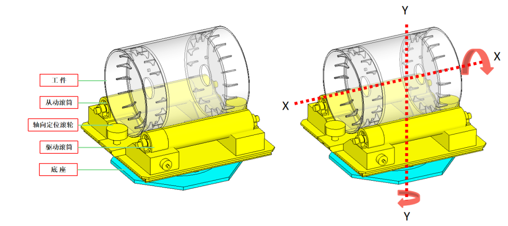 變位機(jī)包含可以使工件繞軸向中心旋轉(zhuǎn)的X軸以及繞變位機(jī)底座中心旋轉(zhuǎn)的Y軸,兩軸均為聯(lián)動(dòng)伺服電機(jī)控制,其中X軸為雙驅(qū)動(dòng)。X軸轉(zhuǎn)動(dòng)范圍為±360°,Y軸轉(zhuǎn)動(dòng)范圍為±180°。